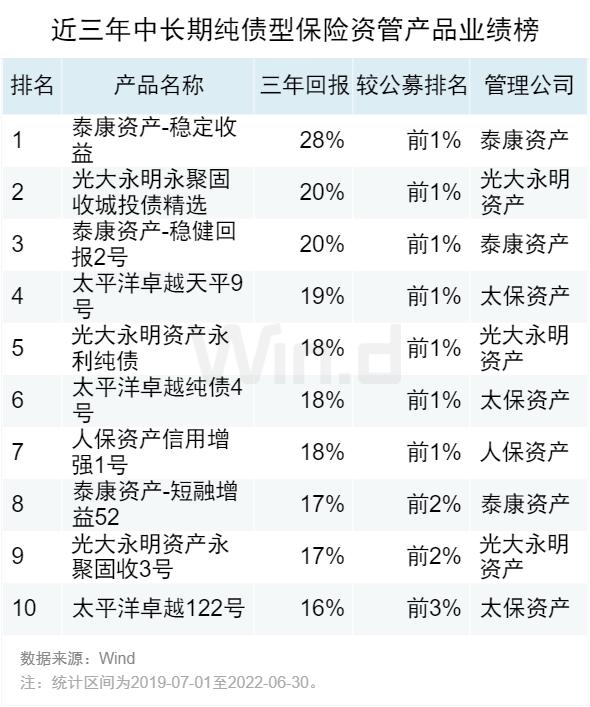 近三年中长期纯债类保险资管产品中,泰康资产-稳定收益与光大永明永聚固收城投债精选以28%、20%的回报位列第一、第二名。入榜前7名三年收益均处于同类公募基金前1%队列。