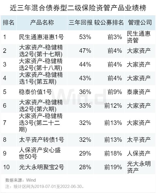 近三年混合债券型二级保险资管产品前十名中一半来自大家资产,前十名平均回报37.82%。民生通惠港惠1号则以53%的回报继续稳坐首位。