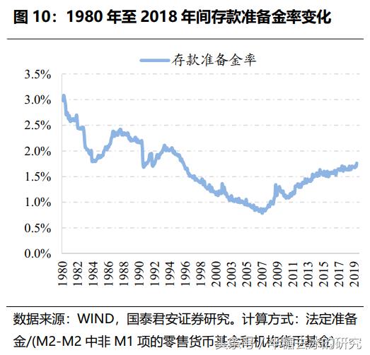 (1)盈利需求为同业、现金及准备金资产占比长期走低原因。同业、现金及准备资产占比长期走低,说明当同业间流动性充足,存款准备金率下行时,银行在考虑到经营利润的展业目标势必配置收益率更高的资产。从1960年至2018年间利率变化情况,可以观察到贷款利率在绝大多数时间高于联邦基金利率,且利差在1975年后逐渐走宽。当经济增长平稳,金融机构流动性充裕,存款准备金率下行时,同业、现金及准备金资产配置需求势必随贷款与同业利差走阔而降低。这体现在商业银行资产结构上就表现为同业资产比重逐渐走低。