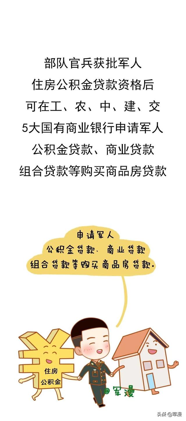 部队官兵获批军人住房公积金贷款资格后,可在工、农、中、建、交。5大国有商业银行申请军人公积金贷款、商业贷款,组合贷款等购买商品房贷款。