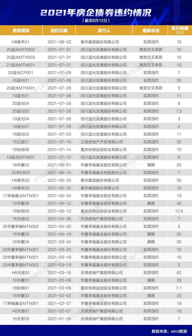 实际上,今年以来,房地产行业债券违约现象相比过去两年大幅增加。根据wind数据显示,2021年至今,已经有超过38只涉房债券违约,牵涉债券发行规模达587.2亿元。