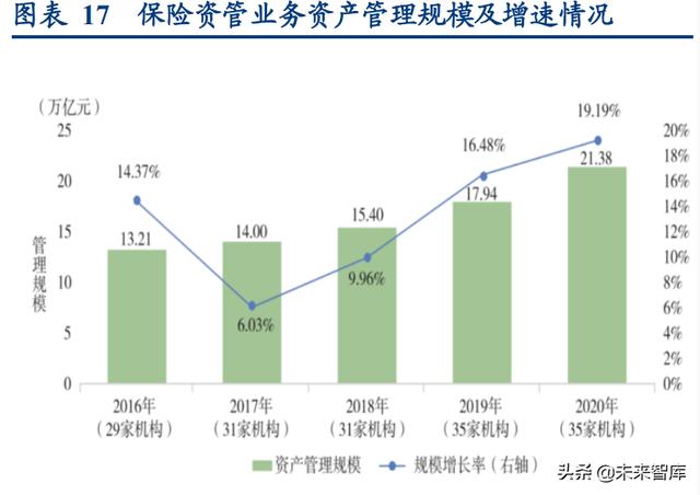 保险资管业务管理的资金主要来源于保险资金,受资管新规影响有限,规模持续增 长。2020 年末,保险资管业务管理的资金来源于系统内保险资金规模占比为 69%,第三 方保险资金规模占比为 8%,意味着保费收入是主要资金来源,面临资金多层嵌套风险较 小,且前期监管对资金使用的要求严格,受资管新规影响有限;资管新规后保险资管业 务规模持续增长,2020 年末规模为 21 万亿,同比增长 19%;2021 年末,以保险资金运 用余额规模估计,预计规模上升至 22.5 万亿附近。