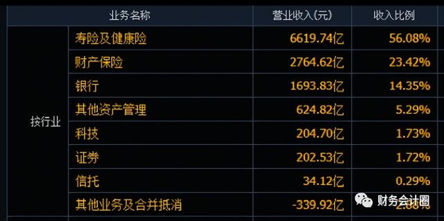 以中国平安为例,按照收入的行业分析,主要是:寿险及健康险占比约56%,财产保险23%,银行业收入14%,详见下图4: