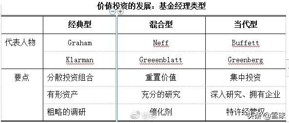 从基金经理的分类上说,价值投资的基金经理也不是铁板一块,分成了几大块。一块叫经典型,经典型就是传统型,就是格雷厄姆本人了还有卡拉曼。混合型的就是内夫和格林布拉特。当代型就是巴菲特和格林伯格。